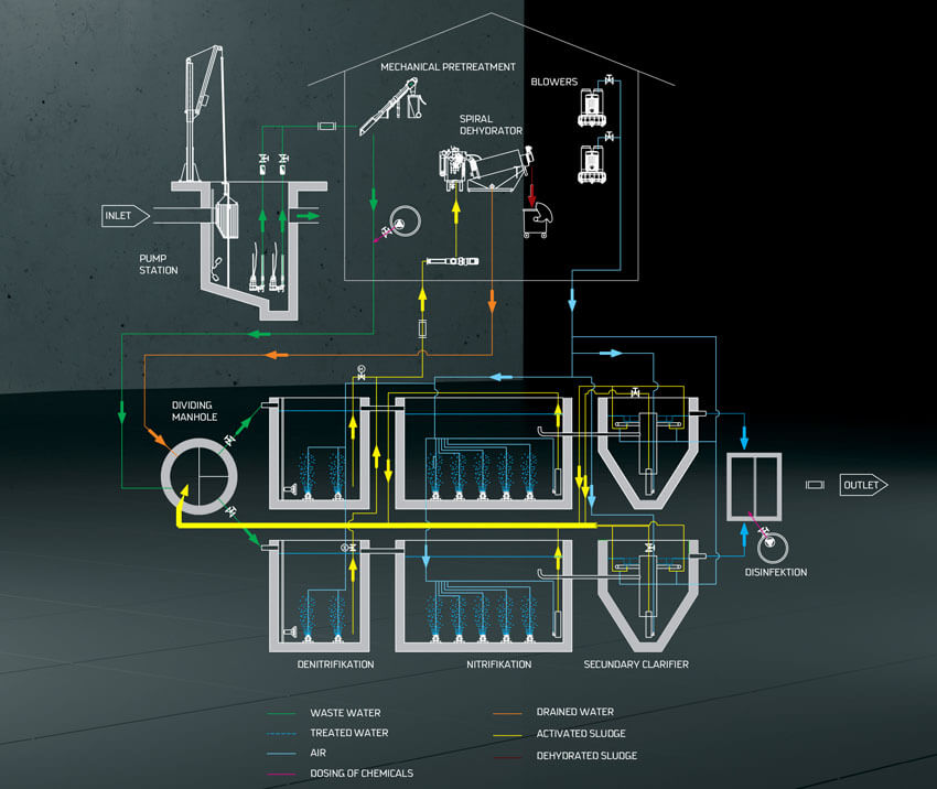 Dizajni i pajisjeve për trajtimin e ujërave të zeza bazohet në gjetjet më të fundit të trajtimit mekanik, biologjik dhe kimik të ujërave të zeza.