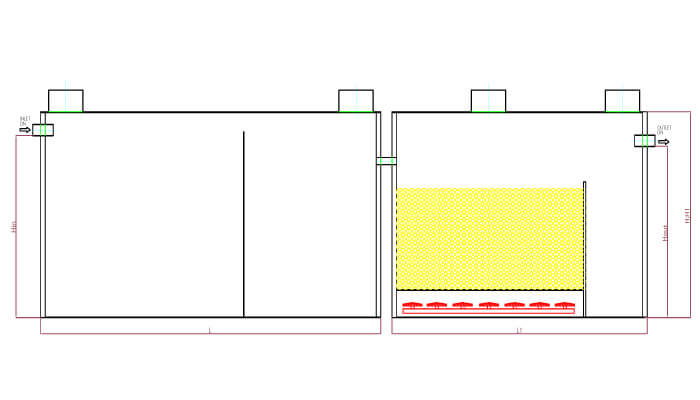 Lloji i WWTP PE Q(m3/day) BOD5(kg/day) L(mm) B(mm) H(mm) L1(mm) B1(mm) H1(mm) Hin(mm) Hout(mm) DN(mm) Fuqia (W) Pesha (kg)