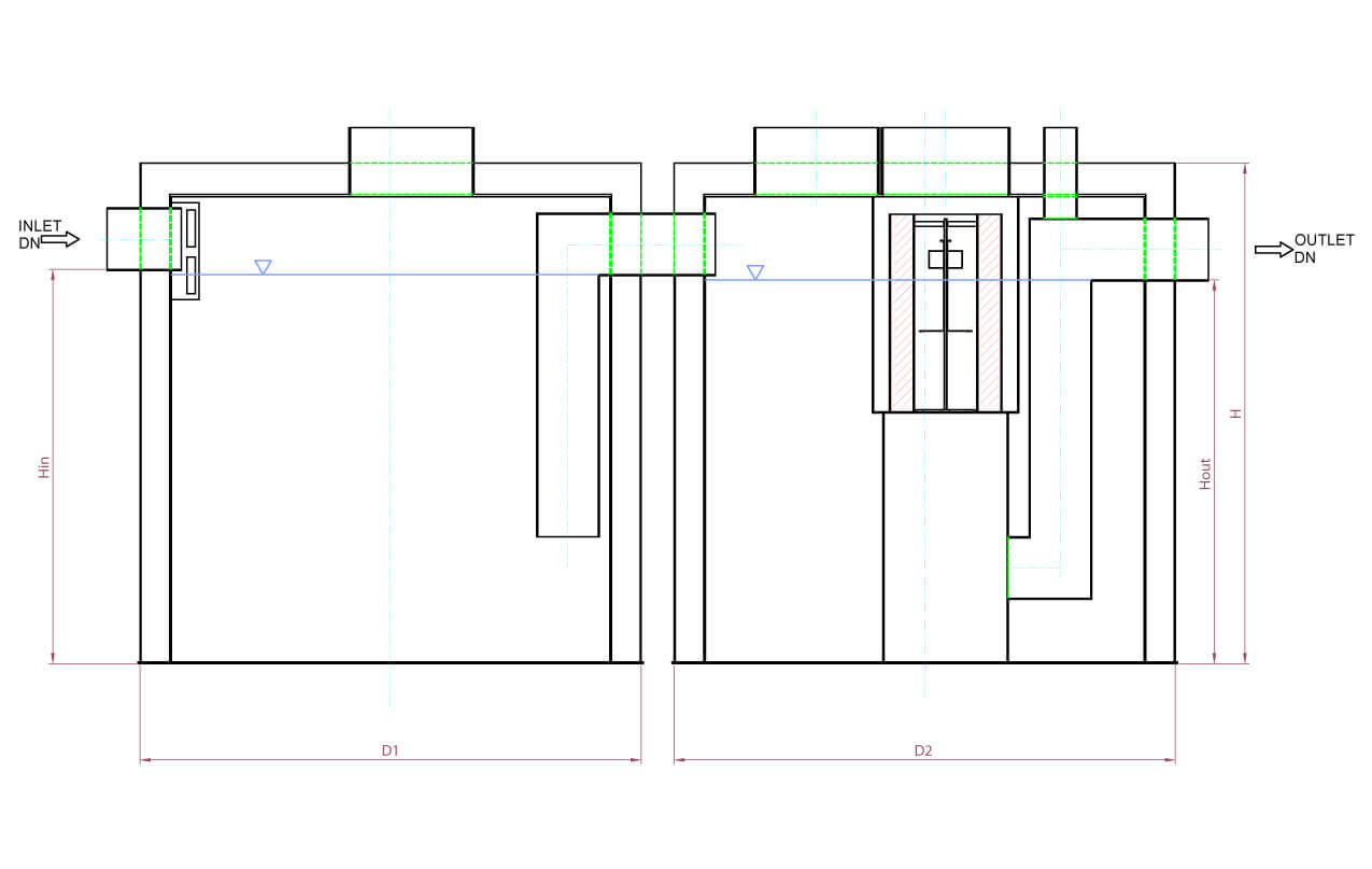Lloji i separatorëve Q (l/s) D1(mm) D2(mm) H(mm) Hin(mm) Hout(mm) DN(mm) Betoni (m3) Pesha (kg)